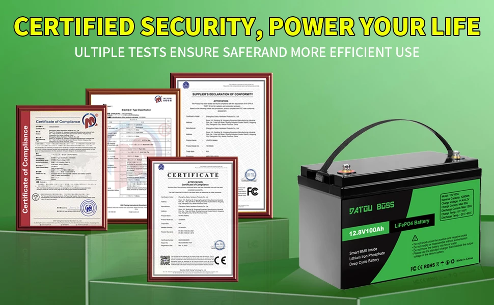 DATOUBOSS 12V 100Ah lifepo4 batteries are made from automotive grade lithium iron phosphate batteries and ABS casings and feature higher energy density, more stable performance and more power after strict quality control and testing to ensure that each battery can provide reliable performance.