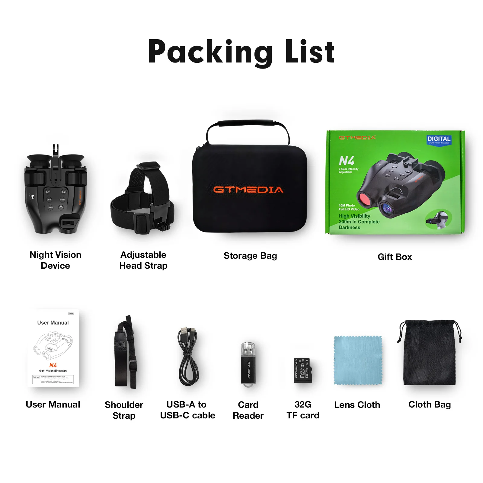 Night vision binoculars N4, the night vision distance is about 300 meters in complete darkness, 850nm infrared LED, 7-level brightness adjustable, can shoot 1080P high-definition video, with 5x digital zoom function, can be used outdoors day and night
